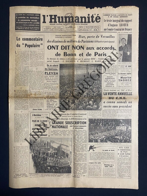 8 PAGES-43 CM X 60 CM-EN UNE: LE COMMENTAIRE DU "POPULAIRE"-HIER, PORTE DE VERSAILLES DES DIZAINES DE MILLIERS DE PARISIENS ONT DIT NON AUX ACCORDS DE BONN ET DE PARIS, PHOTO, SUITE P5-FOULE ENORME AU VEL' D'HIV' LA VENTE ANNUELLE DU CNE A CONNU SAMEDI UN SUCCES SANS PRECEDENT, PHOTO, SUITE P2, 2 TIERS DE PAGE, 16 PHOTOS (FRANCIS CARCO-SIMONE RENANT-MITELBERG-ARAGON-PICASSO ET ALICE AHRWEILER-JEAN PAUL SARTRE-ELSA TRIOLET-.)-P3: L'ABWEHR RECONSTITUEE A BONN SOUS L'AUTORITE DE THEODOR BLANK-P4: LE RAPPORT D'AUGUSTE LECOEUR AU COMITE CENTRAL DE DRANCY-P6: GRISOU: 26 MINEURS TUES A SERAING SUR MEUSE (BELGIQUE)-DES MILLIERS DE PARTICIPANTS ONT AFFIRME: NOUS NE PERMETTRONS PAS LE REARMEMENT DES BOURREAUX DE CHATEAUBRIANT