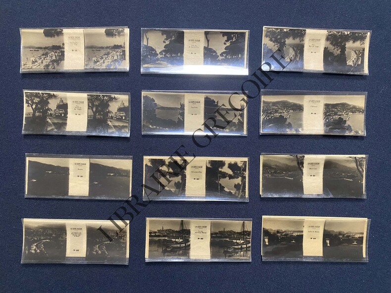 4,5 CM X 11 CM-13 JUAN LES PINS LA PLAGE-14 UNE RUE DE JUAN LES PINS-15 NICE BAIE DES ANGES-16 NICE PROMENADE DES ANGLAIS-17 CAP FERRAT-18 VILLEFRANCHE-19 BEAULIEU-20 ST LAURENT D'EZE-21 MONTE CARLO-22 MONACO-23 LE PORT ET LE VIEUX MENTON-24 JARDINS DE MONACO-SANS DATE (VERS 1950)