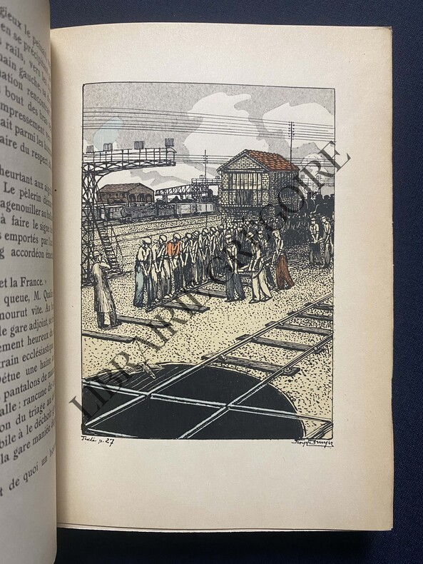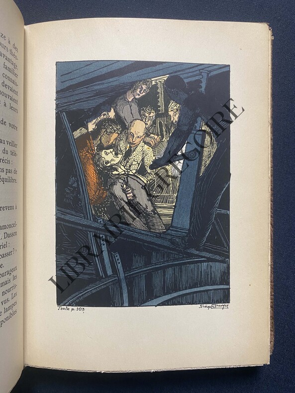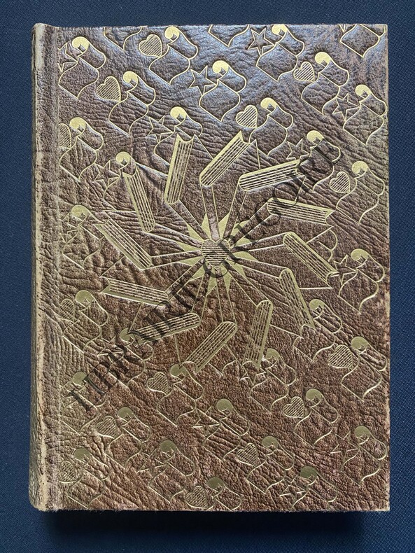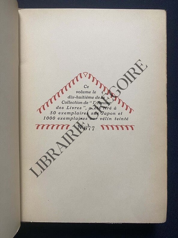 L'exemplaire de la bibliothèque de René Kieffer. 18e volume de la collection « L'amour des livres ». Un des 50 exemplaires sur Japon impérial, celui-ci le n°3. Suivent 1000 exemplaires sur vélin de cuve. L'ouvrage est truffé du contrat souscrit avec Gallimard pour les droits sur l'ouvrage. Seule « collection » jamais proposée par les éditions René Kieffer, « L'amour des livres » comprend 20 volumes, parus entre 1924 et 1929. Les ouvrages qui la composent se ressemblent plus par la maquette que par le texte : auteurs contemporains y côtoient Stendhal ou Pouchkine. En outre, « L'amour des livres » détonne du reste de la production des éditions Kieffer en ce que l'illustration se limite à quelques ornements en début et fin de chapitres ou à un encadrement du texte. Présentés comme des éditions « demi-luxe », les ouvrages de la collection sont vendus à des prix plus bas que le reste des productions Kieffer. Le coût des exemplaires sur vélin tourne autour de cinquante francs, celui des exemplaires sur Japon autour de cent francs ; cela n'empêche pas le critique Clément-Janin de louer la prestation de l'éditeur : « Cette collection est intéressante et comme texte et comme présentation. La typographie y est maîtresse. Le décor lui est subordonné, ce qui est une bonne discipline ». Les couvertures arborent des motifs simples, géométriques ou emblématiques. Kieffer semble avoir proposé pour la collection deux reliures éditeurs ornées à la plaque : la présente en cuir arborant un décor de faisceaux sur les plats et le dos, et une seconde en cartonnage papier à décor d'emblèmes : coeurs, livres, étoiles, etc. Sanjuan 85