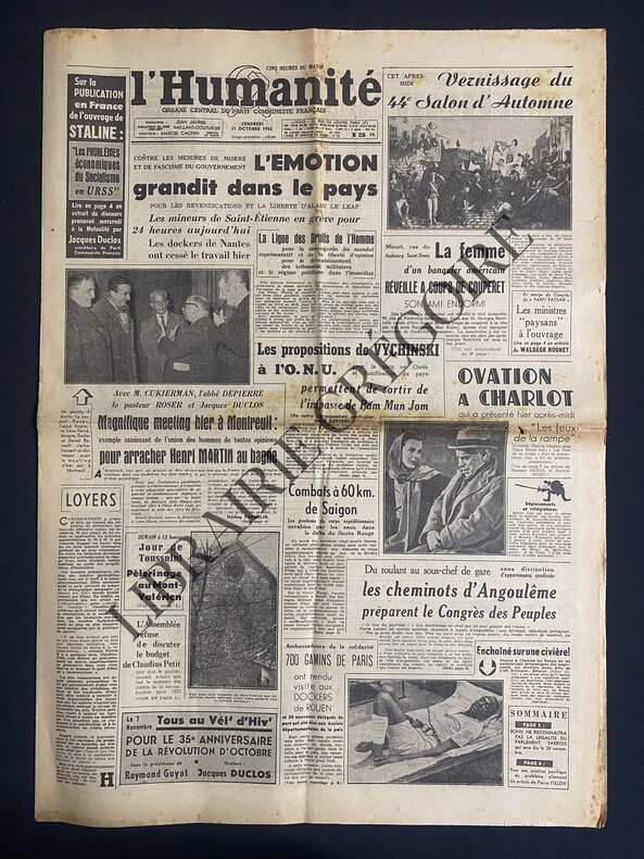 8 PAGES-43 CM X 60 CM-EN UNE: LES PROPOSITIONS DE VYCHINSKI A L'ONU-OVATION A CHARLOT QUI A PRESENTE HIER "LES FEUX DE LA RAMPE", PHOTO-P2: LIMELIGHT UNE TRAGEDIE OPTIMISTE, PAR GEORGES SADOUL-P4: SUR LA PUBLICATION EN FRANCE DE L'OUVRAGE DE STALINE: LES PROBLEMES ECONOMIQUES DU SOCIALISME EN URSS, PAR JACQUES DUCLOS-P6: HENRI MATISSE ET PABLO PICASSO: MESSAGE DE PAIX-P8: LES "FOLLES NUITS" ESTUDIANTINES, PAR JEAN-PIERRE CHABROL, PHOTO