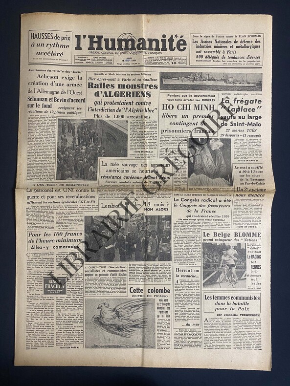 6 PAGES-43 CM X 60 CM-EN UNE: LA FREGATE "LAPLACE" SAUTE AU LARGE DE SAINT-MALO, 2 PHOTOS, SUITE P6-HIER A PARIS ET EN BANLIEUE RAFLES MONSTRES D'ALGERIENS QUI PROTESTAIENT CONTRE L'INTERDICTION DE "L'ALGERIE LIBRE", PHOTO, SUITE P6-LES FEMMES COMMUNISTES DANS LA BATAILLE POUR LA PAIX, PAR JEANNETTE VERMEERSCH-CETTE COLOMBE OEUVRE DE PICASSO VOLE VERS LE 2e CONGRES MONDIAL DES PARTISANS DE LA PAIX, PHOTO, SUITE P2-