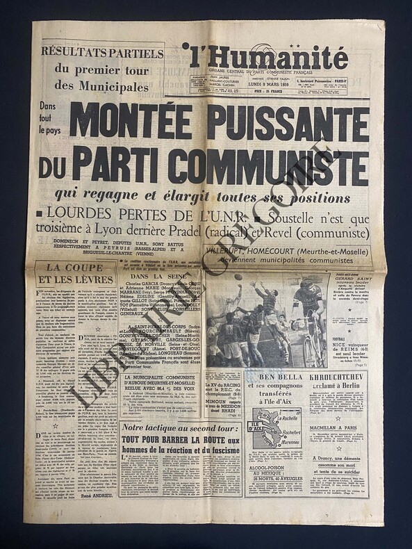 8 PAGES-43 CM X 60 CM-EN UNE: RESULTATS PARTIELS DU PREMIER TOUR DES MUNICIPALES DANS TOUT LE PAYS MONTEE PUISSANTE DU PARTI COMMUNISTE-BEN BELLA ET SES COMPAGNONS TRANSFERES A L'ILE D'AIX, CARTE, SUITE P3-P2: "ELSA" POEME D'ARAGON, PAR ANDRE WURMSER-AVEC SON IMPORTANTE EXPOSITION A LA GALERIE COARD FRANCOISE GILOT FRANCHIT UNE ETAPE NOUVELLE, 1 PHOTO ("MATERNITE")-MON VILLAGE CONTES DE JEAN CAU AVEC DES DESSINS DE SINE (UNE SINEMATOUGRAPHIE TRES CAUCASSE.)