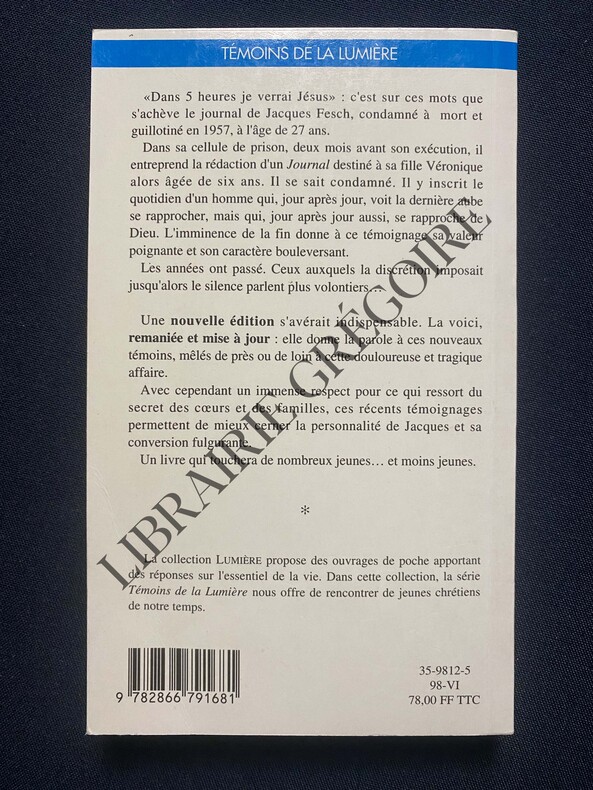 "Collection ""La Sarment"". Collection ""Témoins de la lumière"". Classification Dewey : 848-Ecrits divers, citations, journaux intimes, souvenirs, mémoires"