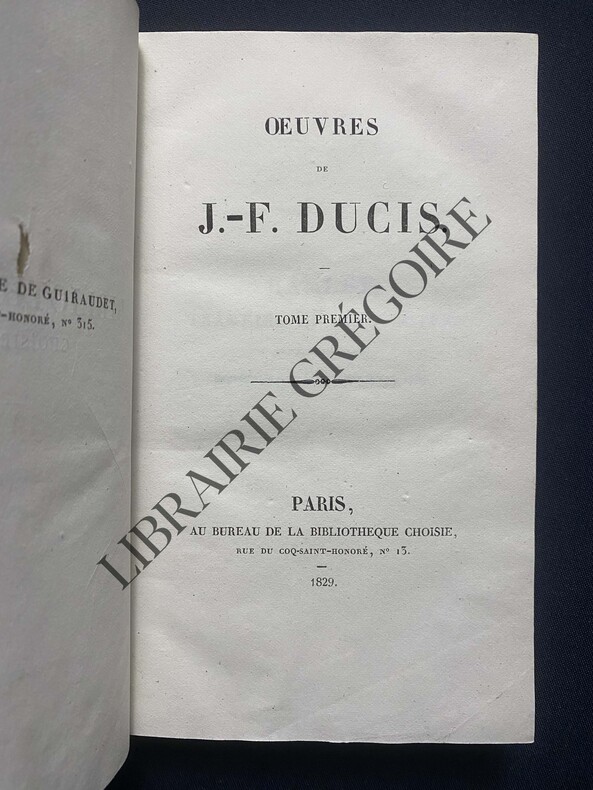 Paris L. de Bure, Libraire, 1824-1826 1824 in 16 (12x8) 5 volumes reliures demi basane maroquinée verte de l'époque, dos lisses ornés de filets dorés et d'un important décor estampé à froid à motif floral (reliures romantiques), CXXXI et 219 pages [1], 342 pages [1], 330 pages [1], 348 pages, 336 pages, rousseurs éparses. Suivi de: Oeuvres posthumes, Tomes 1-2, portrait gravé en frontispice, 282 pages [1] et 300 pages. Jean-François Ducis, Poète français, Versailles 1733-1816. Ensemble 7 volumes. Bel exemplaire ( Photographies sur demande / We can send pictures of this book on simple request )