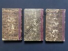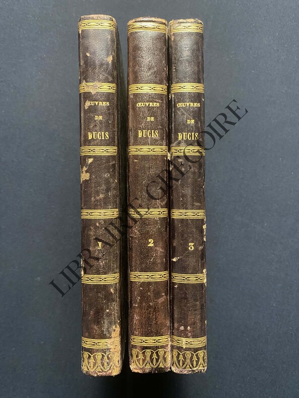 3 TOMES-13 CM X 21 CM-RELIURE DOS CUIR-TOME PREMIER: 1829, 396 PAGES, HAMLET, ROMEO ET JULIETTE, OEDIPE CHEZ ADMETE, LE ROI LEAR, MACBETH-TOME SECOND: 1829, 406 PAGES, JEAN-SANS-TERRE OU LA MORT D'ARTHUR, OTHELLO OU LE MORE DE VENISE, ABUFAR OU LA FAMILLE ARABE, OEDIPE A COLONE, CORRESPONDANCE DE THOMAS AVEC DUCIS, REPONSE DE M. L'ABBE DE RADONVILLIERS DIRECTEUR DE L'ACADEMIE FRANCAISE, VIE DE SEDAINE PAR J.-F. DUCIS-TOME TROISIEME: 1830, 372 PAGES, LE BANQUET DE L'AMITIE, EPITRES, POESIES DIVERSES-(E1125)