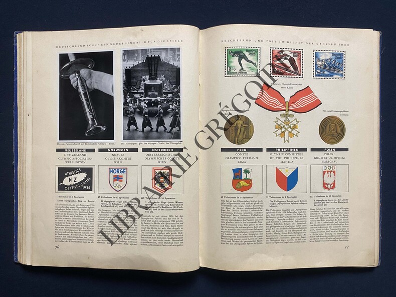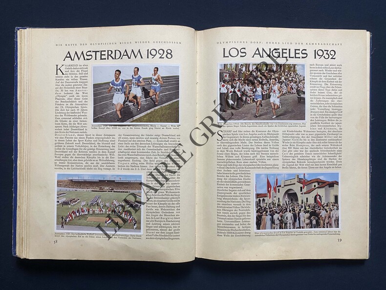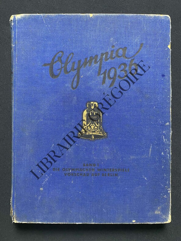 Créé et édité en 1936 par Cigaretten-Bilderdienst Altona-Bahrenfeld. Cet In-folio relié pleine toile bleue contient 167 pages. Couverture de toile bleue avec titre noir et emblème doré des JO de 1936. C'est une marque de cigarettes qui publia ces albums à des fins publicitaires. Les photos à coller dans les espaces prévus à cet effet, se trouvaient dans les paquets de cigarettes et étaient collectionnées afin de remplir deux albums. Textes en allemand.