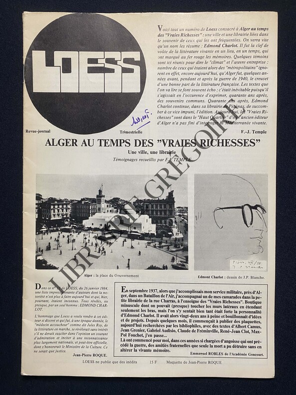 24 PAGES-20,7 CM X 29,7 CM-ALGER AU TEMPS DES "VRAIES RICHESSES", TEMOIGNAGES RECUEILLIS PAR F.J. TEMPLE-L'ALGER DES ANNEES TRENTE-LA LITTERATURE EN ALGERIE: 1934-1946-LA RUE CHARRAS A ALGER-CHARLES BOUTY, TEMOIN DE LA VIE ALGERIENNE-PAGES ALGERIENNES, PAR RENE IZAC, 2 PAGES-ALBERT CAMUS: UNE RENCONTRE, PAR BLANCHE BALAIN, 2 PAGES, 4 PHOTOS-MANIFESTE D'ALBERT CAMUS-LE COMBAT D'EDMOND CHARLOT-LA PASSION D'UN JEUNE EDITEUR: EDMOND CHARLOT-LES LIBRAIRIES ET GALERIES D'EDMOND CHARLOT, 1P, 6 PHOTOS-EDMOND CHARLOT COMME LE SAINT DES LEGENDES ALGEROISES, PAR HIMOUD BRAHIMI, 1P-NOUS FUMES LE REVE D'EDMOND CHARLOT, PAR JULES ROY, 1 PAGE, PHOTO-EDMOND CHARLOT: UN HOMME DE COMMERCE-BIBLIOGRAPHIE SOMMAIRE DES EDITIONS CHARLOT-LA LITTERATURE EN MARCHE, PAR J.F. TEMPLE, 1P, PHOTO