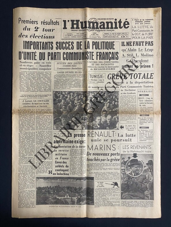 8 PAGES-43 CM X 60 CM-EN UNE: RENAULT: LA LUTTE UNIE SE POURSUIT, PHOTO (MEETING BILLANCOURT)-LES REVENANTS DE LA WEHRMACHT NAZIE, SPEIDEL, PHOTO-P2: DEUX GRANDES OEUVRES DE PICASSO "LA GUERRE" ET "LA PAIX" EXPOSEES A ROME-P8: UN MEDECIN PARISIEN FABRIQUAIT ET VENDAIT UN "REMEDE MIRACULEUX" IL EST INCULPE, MENETRIER