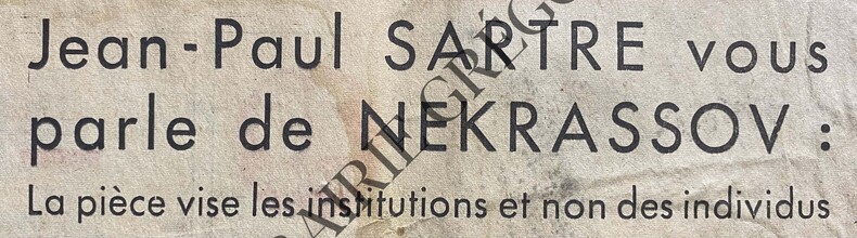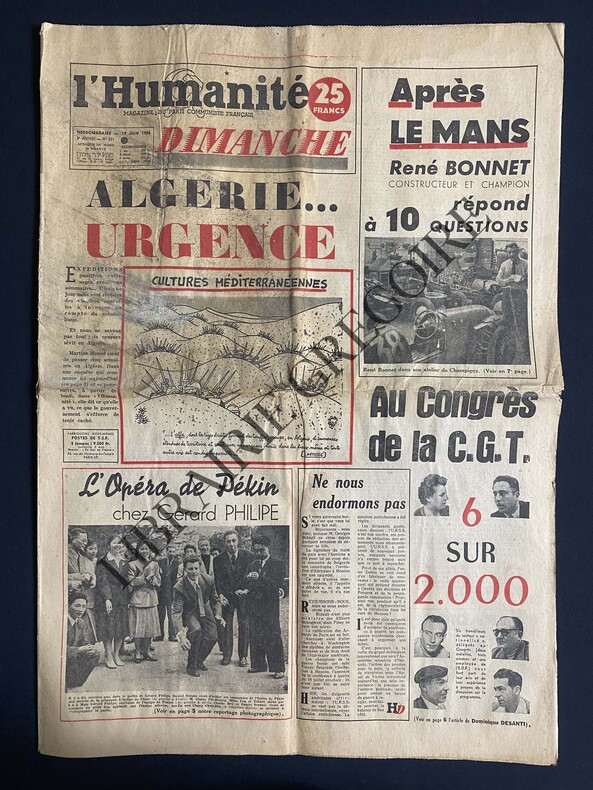 12 PAGES-43 CM X 60 CM-EN UNE: ALGERIE.URGENCE, DESSIN JEAN EFFEL, SUITE P3, PHOTO-APRES LE MANS RENE BONNET REPOND A 10 QUESTIONS, PHOTO, SUITE P7, 5 PHOTOS-L'OPERA DE PEKIN CHEZ GERARD PHILIPE, PHOTO (PARTIE DE PETANQUE)-P2: JEAN-PAUL SARTRE VOUS PARLE DE NEKRASSOV-MITELBERG SCULPTEUR, PHOTO (PELOTON D'EXECUTION NAZI)-P3: AVANT HELSINKI, VLADIMIR POZNER VOUS DIT CE QU'EST UN CONGRES DE LA PAIX-PAGE 5: L'OPERA DE PEKIN CHEZ GERARD PHILIPE, 1 PAGE, 8 PHOTOS-P6: AU CONGRES DE LA CGT 6 SUR 2.000, PAR DOMINIQUE DESANTI, 3 QUARTS DE PAGE, 3 PHOTOS-P8: LA SEMAINE DE M.PELLICULE: FUTURES VEDETTES, PHOTO (BRIGITTE BARDOT-ISABELLE PIAT), LES GAITES DE L'ESCADRON, PHOTO JEAN RICHARD-DEUX FAUST ET M. LEON MEPHISTO SUR LE PLATEAU DE JOINVILLE, 3 PHOTOS (YVES MONTAND-CLAUDE AUTANT-LARA)-P9: LE CHANT INTERROMPU UNE LETTRE INEDITE DE JULIUS ROSENBERG, 1 PAGE, DESSIN FERNAND LEGER (14 CM X 14 CM-COUPLE ROSENBERG AVEC COLOMBE)-QUART SUP GAUCHE DE UNE SALI