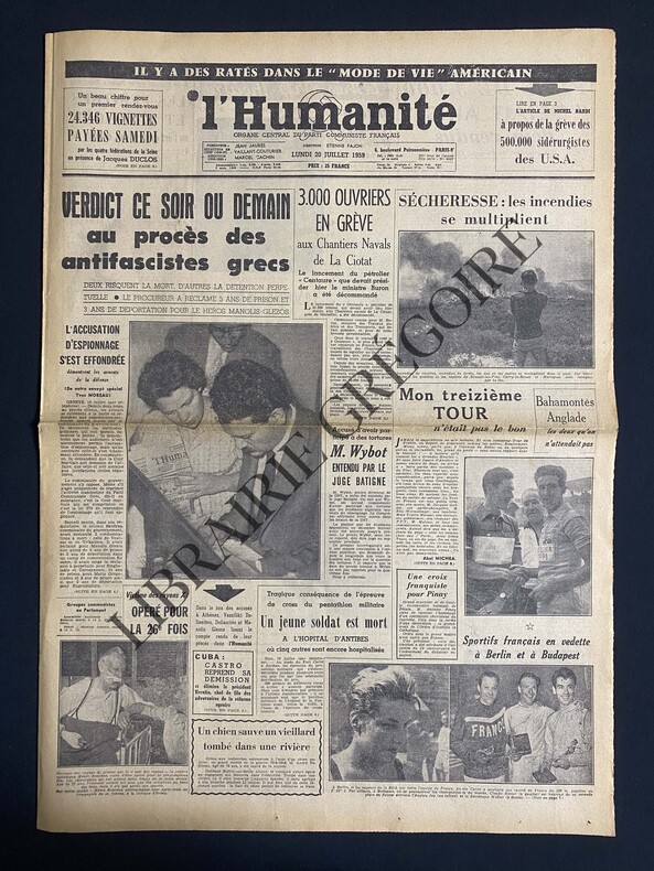8 PAGES-43 CM X 60 CM-EN UNE: VERDICT CE SOIR OU DEMAIN AU PROCES DES ANTIFASCISTES GRECS, PHOTO-3000 OUVRIERS EN GREVE AUX CHANTIERS NAVALS DE LA CIOTAT, SUITE P5-BAHAMONTES ANGLADE LES DEUX QU'ON N'ATTENDAIT PAS, PHOTO-SECHERESSE: LES INCENDIES SE MULTIPLIENT-UNE CROIX FRANQUISTE POUR PINAY-P2: A LA MAISON DE LA PENSEE FRANCAISE LES PEINTRES ET L'AFFICHE OU L'ART DANS LA RUE, DANS LA VIE, PAR JULIETTE DARLE, 3 PHOTOS (AFFICHES DE LORJOU, LEGER ET MATISSE)-P3: CUBA: CASTRO REPREND SA DEMISSION-P4: VERDICT CE SOIR OU DEMAIN AU PROCES D'ATHENES, 1P, 2 PHOTOS-P5: GREVE A LA CIOTAT-P6: NORMALIENNE A 14 ANS, PAULETTE CALESSE, PHOTO-P8: BAHAMONTES A GAGNE LE "TOUR", 1P, 2 PHOTOS