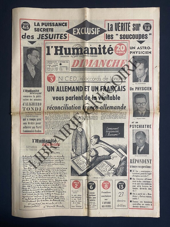 14 PAGES-43 CM X 60 CM-LA PUISSANCE SECRETE DES JESUITES-LA VERITE SUR LES SOUCOUPES VOLANTES-NI CED NI ACCORDS DE LONDRES UN ALLEMAND ET UN FRANCAIS VOUS PARLENT DE LA VERITABLE RECONCILIATION FRANCO-ALLEMANDE, DESSIN MITELBERG-VOICI LES 5 CONCLUSIONS QUE L'ON PEUT DEJA TIRER DE L'AFFAIRE DES FUITES-A LA VENTE DU CNE LE 30 OCTOBRE AU VEL D'HIV' VOUS TROUVEREZ L'HISTOIRE D'ANTON TCHEKHOV UN LIVRE D'ELSA TRIOLET-DES EX-LIBRIS DE FERNAND LEGER A LA VENTE DU CNE, 2 PHOTOS (EX-LIBRIS GEORGE SAND ET ARTHUR RIMBAUD)-LES FOOTBALLEURS DE DYNAMO DE MOSCOU EN ROUTE POUR LA FRANCE