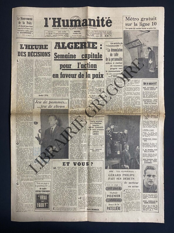 8 PAGES-43 CM X 60 CM-EN UNE: ALGERIE: SEMAINE CAPITALE POUR L'ACTION EN FAVEUR DE LA PAIX, SUITE P5-UN ARTICLE DU "COMMUNISTE": "LA DENONCIATION DU CULTE DE LA PERSONNALITE AIDERA A REALISER DE NOUVEAUX PROGRES VERS LE COMMUNISME", SUITE P3-JEU DE POMMES.JEU DE CLOWN, PHOTO OLEG POPOV-AVEC "TILL ULENSPIEGEL" GERARD PHILIPE FAIT SES DEBUTS DE METTEUR EN SCENE, PHOTO-P2: LE CIRQUE DE MOSCOU EST PARISIEN, PHOTO-UN ENTRETIEN PAR JOUR: DENYS DE LA PATELLIERE-ANDRE HUNEBELLE QUI TOURNE ACTUELLEMENT "MANNEQUINS DE PARIS" UTILISE DE VRAIS MANNEQUINS POUR REVELER LES DESSOUS DE LA HAUTE-COUTURE, PHOTO-"CETTE SACREE GAMINE", PHOTO BRIGITTE BARDOT-P4: VOICI LES 3 PROJETS DE DESARMEMENT ETUDIES A LONDRES