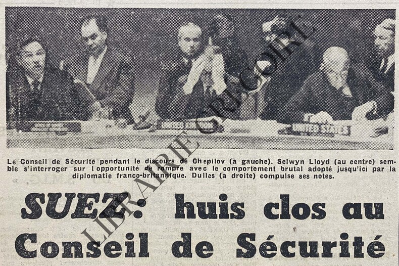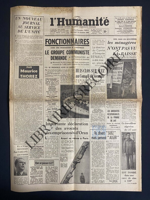 8 PAGES-43 CM X 60 CM-EN UNE: UN NOUVEAU JOURNAL AU SERVICE DE L'UNITE, PAR MAURICE THOREZ-HUIS CLOS SUR SUEZ AU CONSEIL DE SECURITE, PHOTO, SUITE P3, PHOTO-ILS DISENT "SUEZ" MAIS PENSENT "ALGER"-IMPORTANTE DECLARATION DES AVOCATS DES EMPRISONNES D'ORAN-P2: CINEMA: "EN EFFEUILLANT LA MARGUERITE" FILM DE MARC ALLEGRET, PHOTO BRIGITTE BARDOT (5 X 12), "LE BALLON ROUGE" D'ALBERT LAMORISSE, 2 PHOTOS-POUR SES 80 ANS PABLO CAZALS A LA SORBONNE, PHOTO-P4: LES FONCTIONNAIRES PRETS A L'ACTION COMMUNE-P6: ALGERIE SEVERE ACCROCHAGE A LA FRONTIERE ALGERO-TUNISIENNE-TRACES D'ENCRE (MOTS CROISES)