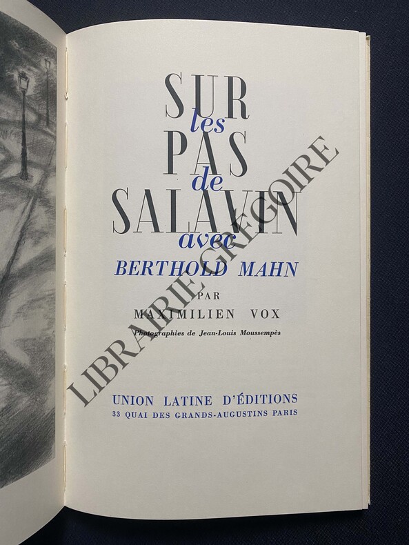 En guise de dédicade, l'éditeur s'adresse "Aux amis de l'Union latine est dédié ce petit livre, composé avec un soin fervent dans le culte de Salavin, l'admiration pour Georges Duhamel, l'affection pour Berthold Mann, l'amitié de Maurice Robert, et le goût fidèle de la Montagne Sainte Geneviève, par Maximilien Vox". Infimes usures à la couverture.