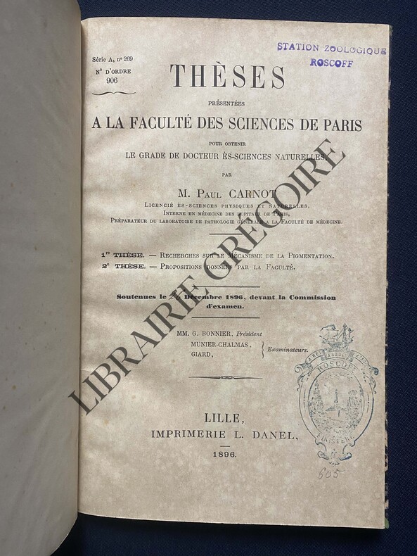 THESES SOUTENUES LE 26 DECEMBRE 1896-84 PAGES-RELIURE DOS CUIR 4 NERFS TITRES DORES-3 CACHETS D'APPARTENANCE EN DEBUT D'OUVRAGE-(20F)