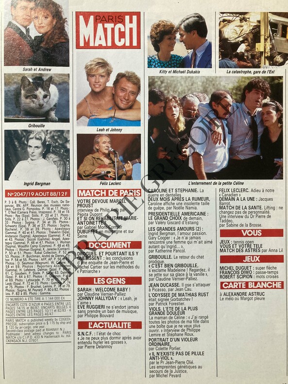 100 PAGES-JOHNNY HALLYDAY ET LEAH EN COUVERTURE-VOTRE DEVOUE MARCEL PROUST-SNCF L'ETAT DE CHOC/GARE DE L'EST-INGRID BERGMAN L'AMOUR PASSION/14P-JEAN DUCASSE IL OSE S'ATTAQUER A PICASSO-FELIX LECLERC ADIEU A NOTRE CANADIEN