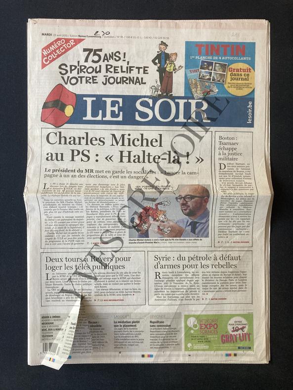 36 PAGES-32 CM X 47 CM-EDITION NAMUR LUXEMBOURG-PERSONNAGES DE SPIROU A TOUTES LES PAGES-PHOTOS MONTAGES-TINTIN SPIROU: QUI EST LE PLUS GRAND?, DANIEL COUVREUR, HUGUES DAYEZ-POUR SES 75 ANS, SPIROU ACCORDE SA PREMIERE INTERVIEW A FANTASIO, 2P-PETITE DECHIRURE SANS MANQUE EN PARTIE SUP DE UNE (PJ2)