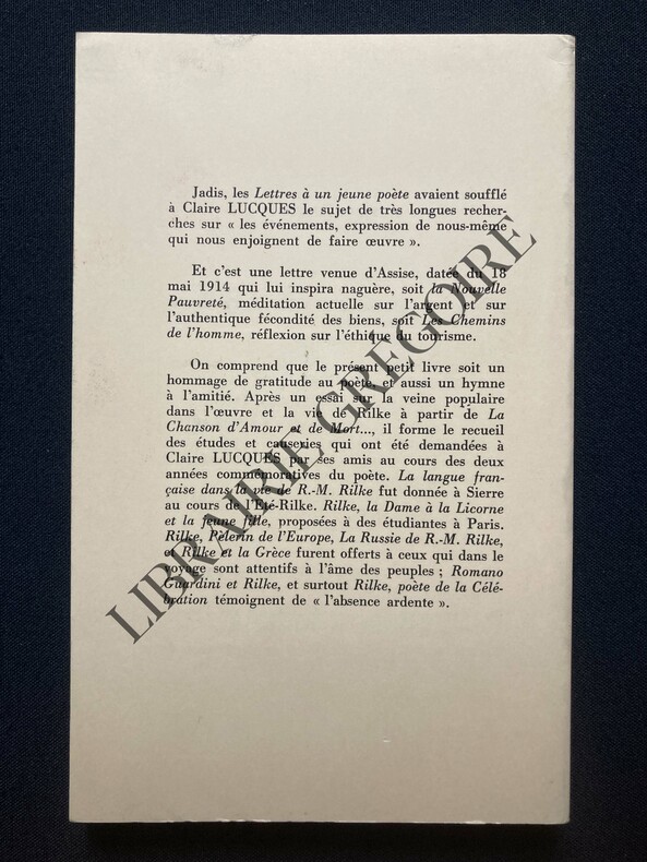 Couverture: gravure de Jeanne Esmein d'après le portrait de Rilke par L. Pasternak. Classification Dewey : 830-Littératures des langues germaniques