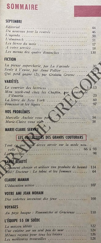 160 PAGES-NUMERO SPECIAL LES COLLECTIONS DES GRANDS COUTURIERS AUTOMNE HIVER 1955 56-CHEZ LES CHAPLIN PAR LOUISE DE VILMORIN, 6P-UNE GRANDE NOUVELLE INEDITE DE LA VARENDE, LA PIEUSE SUPERCHERIE-QUI PERD GAGNE, PAR GRAHAM GREENE, ILLUSTRATIONS ROSWELL KELLER-WALT DISNEY COIFFE LES AMERICAINS D'UN BONNET DE RATON LAVEUR-CHEZ LES GRANDS COUTURIERS LA FEMME 1956, 28 PAGES-10 VEDETTES ONT INVENTE CES 10 JEUX, JEAN RICHARD, ROGER PIERRE-RAMUNTCHO ET GRACIEUSE-8 NATIONS VOUS PROPOSENT LA MAISON IDEALE, 8 PAGES