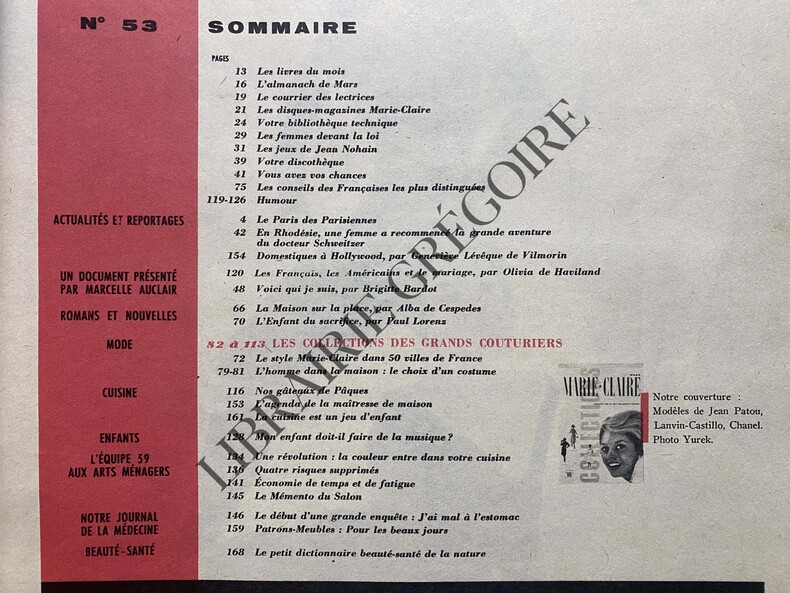 204 PAGES-BRIGITTE BARDOT EN COUVERTURE-POUR MARIE CLAIRE FELICIEN MARCEAU EST SORTI DE SA COQUILLE/2 PHOTOS-EN CE TEMPS LA IL S'APPELAIT ENCORE JEAN VILAIN/3 PHOTOS-CETTE FEMME EST UN NOUVEAU DOCTEUR SCHWEITZER/LAMPLUGH PETIT-VOICI QUI JE SUIS.PAR BRIGITTE BARDOT/12P/PHOTOS-LES COLLECTIONS-SUR LA SCENE DE LA BELLE JARDINIERE LES FRERES JACQUES/3P-DOMESTIQUES A HOLLYWOOD-