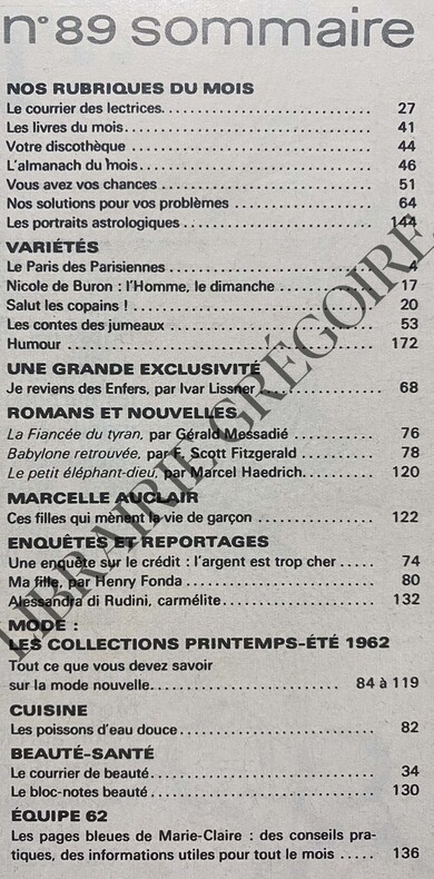 238 PAGES-SCOTT FITZGERALD PAR CHRISTINE DE RIVOYRE/PHOTO-DANIEL FILIPACCHI PRESENTE UNE NOUVELLE "COPINE" SYLVIE VARTAN "LA COLLEGIENNE DU TWIST"/4 PHOTOS-JE REVIENS DES ENFERS/ACHERON-BABYLONE RETROUVEE PAR F.SCOTT FITZGERALD-JANE FONDA PAR HENRY FONDA-COLLECTIONS/LE SECRET CHANEL-ELLE A VECU SOUS LE SIGNE DU FEU: ALESSANDRA DI RUDINI CARMELITE-PUB LE RATON LAVEUR FRIGIDAIRE