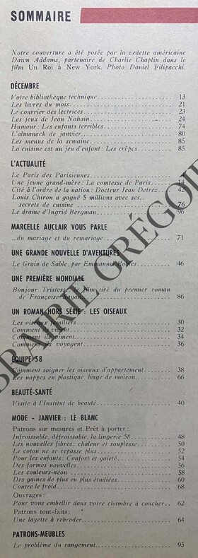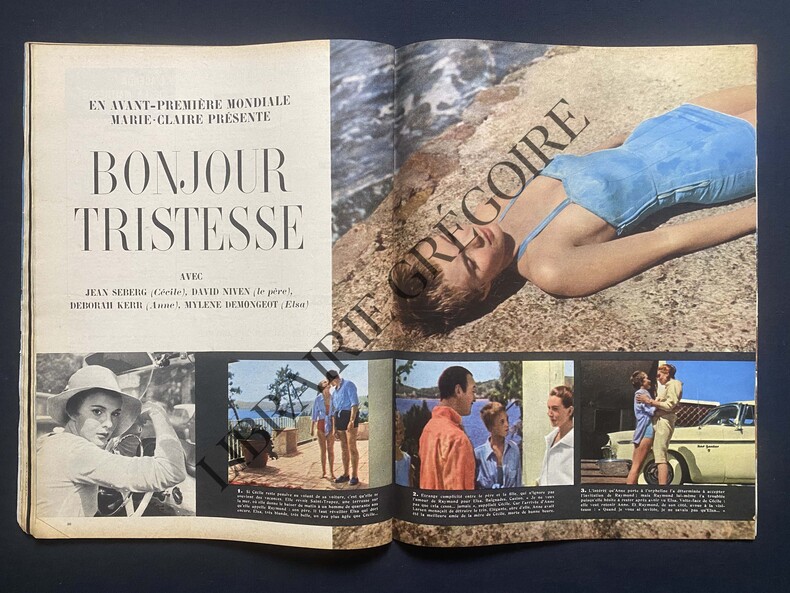 116 PAGES-DAWN ADDAMS EN COUVERTURE-YVES SAINT LAURENT 21 ANS JOUERA SUR UNE COLLECTION SON AVENIR ET LA MAISON DIOR/3P/7 PHOTOS-NOUVEAU COMPOSITEUR A LA MODE UN INGENIEUR DES PONTS ET CHAUSSEES: GUY BEART/PHOTO-FERNAND RAYNAUD LANCE DANS "AUGUSTE" UNE COVER GIRL MARIE CLAIRE: AGNES LAURENT/PHOTO-L'ART D'ETRE UNE JEUNE GRAND MERE/LA COMTESSE DE PARIS/6P-A L'ORDRE DE LA NATION: DR JEAN DETREZ/4P-LE GRAIN DE SABLE/UNE GRANDE NOUVELLE D'AVENTURES D'EMMANUEL ROBLES-EN AVANT PREMIERE MONDIALE MARIE CLAIRE PRESENTE BONJOUR TRISTESSE AVEC JEAN SEBERG DAVID NIVEN DEBORAH KERR MYLENE DEMONGEOT/8P/21 PHOTOS-EN DEUX VISAGES TOUT LE DRAME D'INGRID/4P-LEGERE DECHIRURE COIN SUP DR DE COUV.