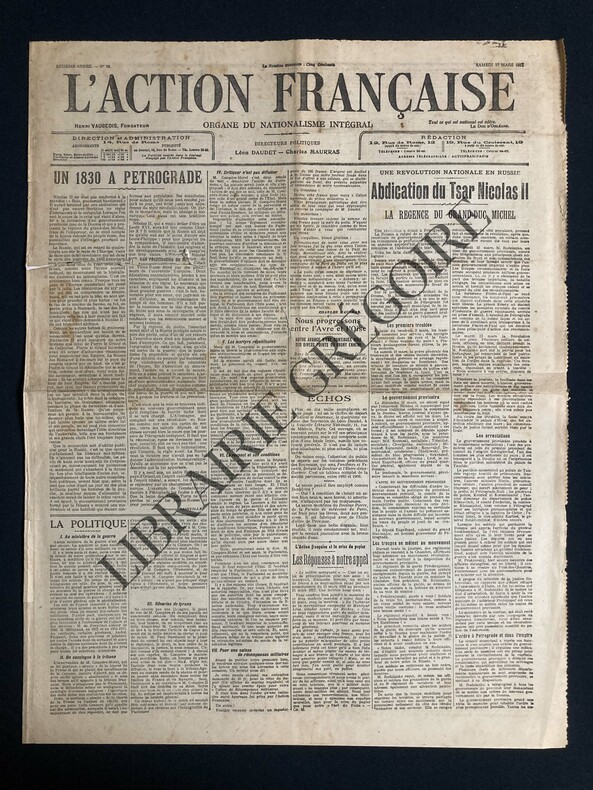 4 PAGES-EN UNE: UNE REVOLUTION NATIONALE EN RUSSIE-ABDICATION DU TSAR NICOLAS II-LA REGENCE DU GRAND DUC MICHEL/ARTICLE IMPORTANT-DECHIRURE SANS MANQUE (20 CM) A RESTAURER