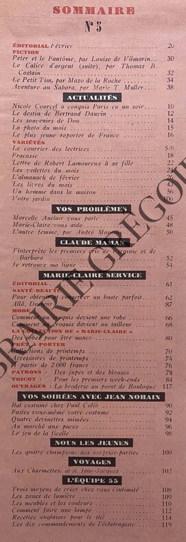 148 PAGES-CINQ ANNEES D'ORGUEIL ONT PERMIS A NICOLE COURCEL DE CONQUERIR PARIS EN UN SOIR-DON OU 40 ANS DE SOUVENIRS ET DE GENTILLESSE-UNE EXPERIENCE REVOLUTIONNAIRE A LA NOUVELLE ECOLE DE BOULOGNE/2P/PHOTOS-"FEVRIER"/DESSIN COULEURS PLEINE PAGE DE PEYNET-BONNE ROUTE MA PETITE CATHERINE/LETTRE DE ROBERT LAMOUREUX A SA FILLE QUI VIENT DE NAITRE-PETER ET LE FANTOME/UNE GRANDE NOUVELLE INEDITE DE LOUISE DE VILMORIN/ILLUSTRATION DE ROSWELL KELLER-LE PETIT TIM/UNE GRANDE NOUVELLE INEDITE DE MAZO DE LA ROCHE/ILLUSTRATIONS DE BOWLER-AVENTURE AU SAHARA/UN RECIT DRAMATIQUE DE MARIE T. MULLER/ILLUSTRATION DE KURT ARD-L'AUTRE FEMME PAR ANDRE MAUROIS-HUBERT DE GIVENCHY VOUS MONTRE COMMENT UN CROQUIS DEVIENT UNE ROBE-ET VOICI COMMENT CHEZ FATH UN CROQUIS DEVIENT UN TAILLEUR-BAL COSTUME CHEZ PAUL COLIN/4P-BRIGITTE BARDOT A MIME CES 4 DEVINETTES/2P-AU MARCHE AUX PUCES, JACQUELINE JOUBERT N'A PAS RATE UNE OCCASION-MARIA MAUBAN ET TOUCHAGUES SONT RESTES PRISONNIERS AU JEU DE LA FICELLE/2P/PHOTOS-AUX CHARMETTES JEAN JACQUES VOUS RACONTE LUI MEME L'AMOUR DE SA JEUNESSE