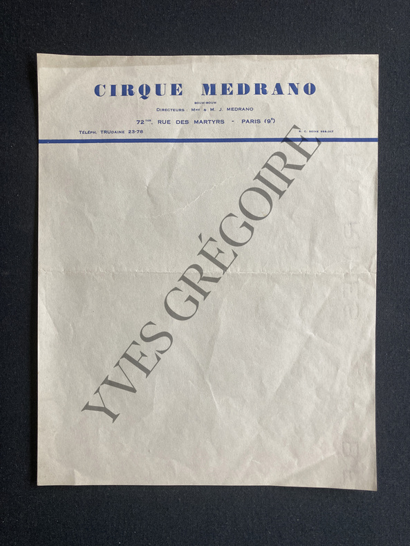 21 CM X 27 CM-EN CARACTERES BLEUS CIRQUE MEDRANO BOUM-BOUM DIRECTEURS MME & M. J. MEDRANO 72 TER, RUE DES MARTYRS-PARIS (9e) TELEPH. TRUDAINE 23-78 R. C. SEINE 553.017-TRAIT DE SEPARATION BLEU-VIERGE-LES FRAIS DE PORT SERONT MINORES-(CLFACT)