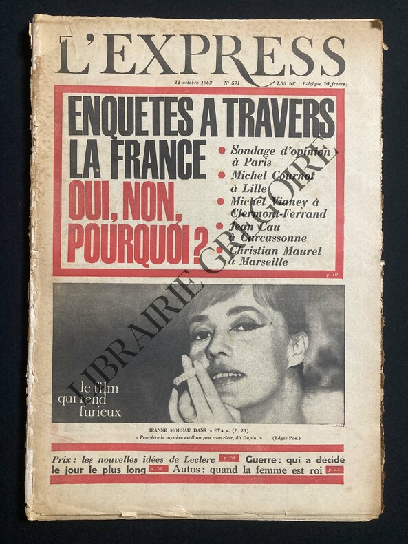 56 PAGES-EN COUVERTURE JEANNE MOREAU DANS EVA-DESSIN DE EFFEL/POUPEES RUSSES-ENQUETE A TRAVERS LA FRANCE/JEAN CAU A CARCASSONNE-A QUOI SERT UN PARLEMENt/ARTICLE DE PIERRE MENDES FRANCE/4P-REPORTAGE/LECLERC ET LA LIBERTE/2P/2 PHOTOS-CINEMA: IRRITANTE EVA/UNE CHARADE SANS SOLUTION/PHOTO DE LOSEY ET J. MOREAU-JAZZ: DEUX MESSAGERS/POUR LE "FUNK" L'ANNEE DU RENOUVEAU/PHOTO DE GERRY MULLIGAN/ARTICLE DE DANIEL FILIPACCHI-ENTRETIEN/"LE JOUR LE PLUS LONG"/CORNELIUS RYAN RACONTE COMMENT S'ENGAGEA LE PARI LE PLUS GIGANTESQUE DE L'HISTOIRE/2P/PHOTOS
