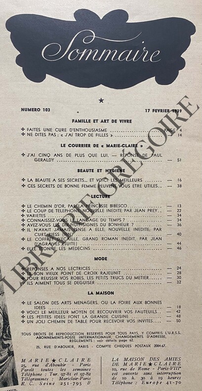 BLOUSE MAGGY ROUFF EN COUVERTURE-LE CHEMIN D'OR PAR LA PRINCESSE BIBESCO-ELLE ETONNE LES MEDECINS/EDNA WALLACE HOPPER/2P/PHOTOS-LE COURRIER DE MARIE CLAIRE/REPONSE DE PAUL GERALDY-EN 4 DE COUVERTURE: PUBLICITE COULEURS DE MONTEBELLO POUR LA JOUVENCE DE L'ABBE SOURY
