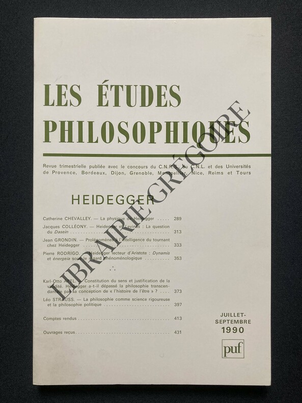 C.CHEVALLEY LA PHYSIQUE DE HEIDEGGER-J.COLLEONY HEIDEGGER ET LEVINAS: LA QUESTION DU DASEIN-J.GRONDIN PROLEGOMENES A L'INTELLIGENCE DU TOURNANT CHEZ HEIDEGGER-P.RODRIGO HEIDEGGER LECTEUR D'ARISTOTE: DYNAMIS ET ENERGEIA SOUS LE REGARD PHENOMENOLOGIQUE-(3D)