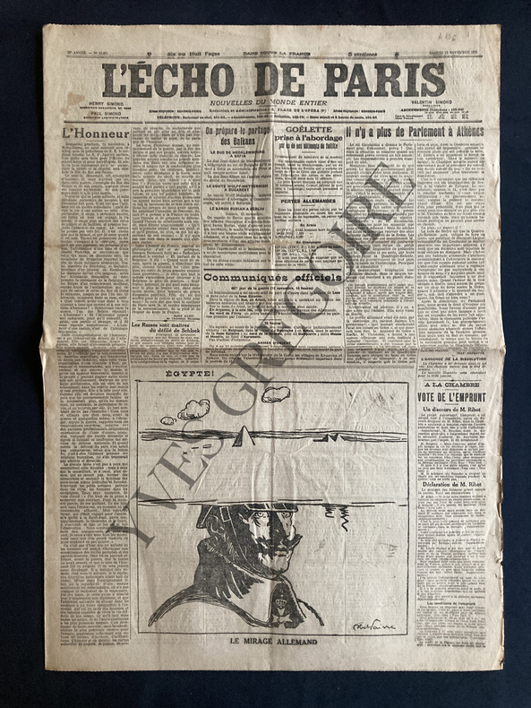 4 PAGES-IL N'Y A PLUS DE PARLEMENT A ATHENES-ON PREPARE LE PARTAGE DES BALKANS-GOELETTE PRISE A L'ABORDAGE PAR UN DE NOS BATIMENTS DE FLOTTILLE-DESSIN DE ABEL FAIVRE/"LE MIRAGE ALLEMAND/GUILLAUME II/"EGYPTE"-HISTOIRE SECRETE DE BERTHA KRUPP D'APRES LES DOCUMENTS DE BARONNE D'ALTAVILLA-L'INTERDICTION DE L'ALCOOL AUX SOLDATS-LES OPERATIONS EN SERBIE-LES ATTENTATS ALLEMANDS INQUIETENT GRAVEMENT LES AMERICAINS-LE TORPILLAGE DE L'ANCONA-LE VAPEUR FIRENZE COULE PAR UN SOUS MARIN