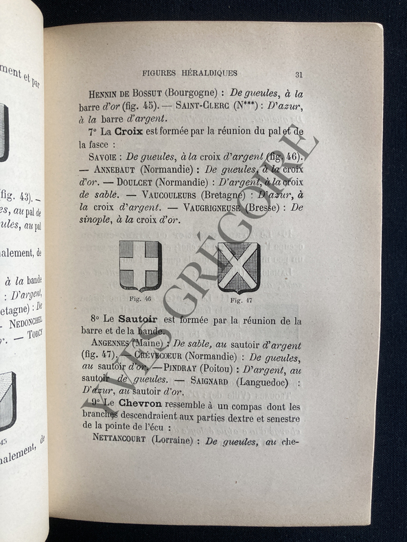 Comprend un glossaire des attributs héraldiques, un traité élémentaire des ordres de chevalerie, des anoblissements, l'origine des noms de famille, les preuves de noblesse, les titres, les usurpations et la législation nobilaire. Voir le sommaire sur photos jointes.