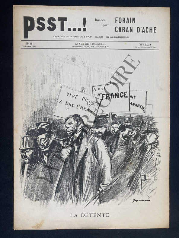 4 PAGES FORMAT 28 CM X 40 CM-COUVERTURE DE FORAIN "DETENTE",DEFILE,PANCARTES "A BAS LA FRANCE" "VIVE PICQUART A BAS L'ARMEE"-P2 CARAN D'ACHE "AU COIN D'UN BOIS",CANDIDAT AUX ELECTIONS-P3 CARAN D'ACHE "LE SABRE DE DAMOCLES"LES DERNIERES NUITS DE BRISSON",FRANC MACONNERIE-P4 CARAN D'ACHE "LES ARMES PARLANTES DE LA PRESSE DREYFUSIENNE"DEVISE:NUL NE M'APPROCHE!",PORC DANS MARE DE BOUE