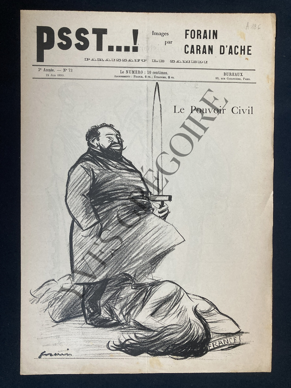 4 PAGES IN FOLIO-COUVERTURE DE FORAIN/"LE POUVOIR CIVIL"-P2 CARAN D'ACHE/"CHAPEAUX HISTORIQUES A VENDRE"-P3 CARAN D'ACHE/"CAIN ET ABEL"-P4 CARAN D'ACHE/"LE MAITRE INTERVIEWE"/ZOLA