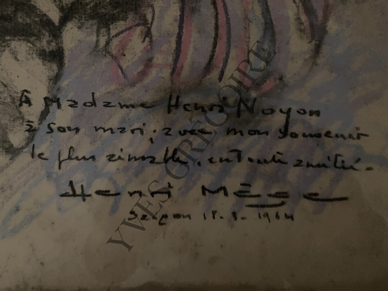 65 CM X 50 CM-EN BAS A DROITE: "A MADAME HENRI NOYON A SON MARI, AVEC MON SOUVENIR LE PLUS AIMABLE, EN TOUTE AMITIE" SIGNATURE "SAIGON 18 3 1964"-HOMME DE PROFIL-LONG NEZ-TRAITE FACON LOUIS XIV-LEGERES TRACES D'HUMIDITE EN MARGE INF-ENCADREE