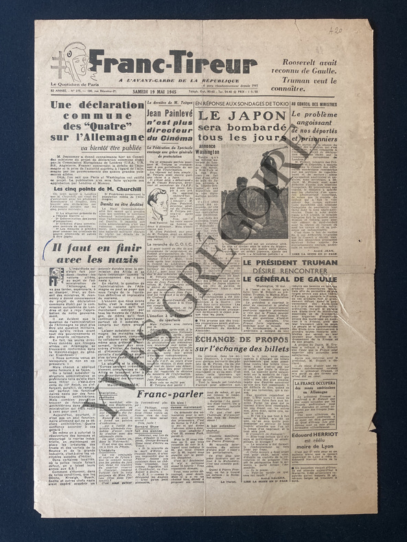 2 PAGES-UNE DECLARATION COMMUNE DES "QUATRE" SUR L'ALLEMAGNE-LES CINQ POINTS DE M.CHURCHILL-JEAN PAINLEVE N'EST PLUS DIRECTEUR DE CINEMA/DESSIN-LE JAPON SERA BOMBARDE TOUS LES JOURS/PHOTO D4UNE EXECUTION-LE PRESIDENT TRUMAN DESIRE RENCONTRER LE GENERAL DE GAULLE-BERNARD SHAW FAIT DES SIENNES/15 LIGNES-EDOUARD HERRIOT EST REELU MAIRE DE LYON-IL FAUT EN FINIR AVEC LES NAZIS-PETAIN DE MONTROUGE-BOUSQUET ET SCAPINI ECROUES A FRESNES-LE PROBLEME DES PRISONNIERS-CERDAN TENET LE 16 JUIN-LES GREVES CONTINUENT-1 DECHIRURE 5 CM EN PLIURE (PJ15)