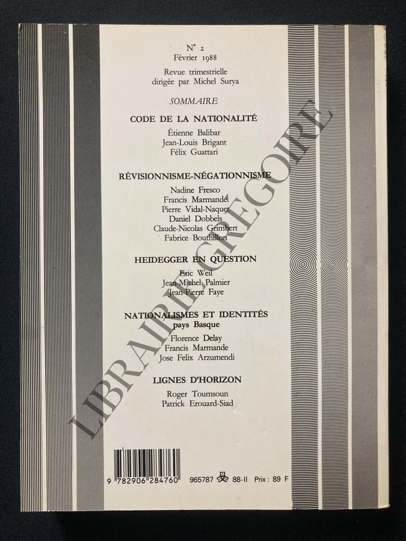 Sommaire : L'avenir du racisme - nationalité et citoyenneté - spéciologues ? - parcours du ressentiment - Hitler était nazi ! ou la mémoire de la mort moquée - la mémoire barbouillée - cheminements d'une perversion intellectuelle (entretien) - une mémoire sans abandon (2) - pour mémoire - comme quoi Napoléon n'a jamais existé - le pas de deux - le cas Heidegger - Heidegger et la national socialisme etc. Classification Dewey : 70.49-Presse illustrée, magazines, revues