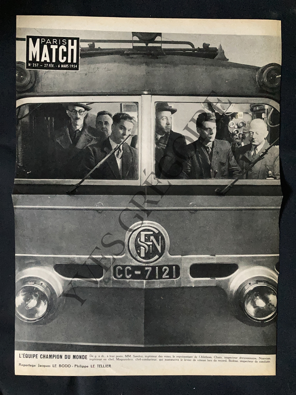 TIRAGE ARGENTIQUE NOIR ET BLANC-SUR PAPIER 18 CM X 24 CM-CABINE VUE DE L'EXTERIEUR-DE GAUCHE A DROITE MM SANDOZ, INGENIEUR DES VOIES, LE REPRESENTANT DE L'ALSTHOM, CHAIX, INSPECTEUR DIVISIONNAIRE, NOUVION, INGENIEUR EN CHEF- MAGNAUDEIX, CHEF-CONDUCTEUR, BODRAS, INSPECTEUR DE CONDUITE-2 CACHETS HUMIDES GROUPE PARIS MATCH TELE 7 JOURS MARIE CLAIRE-MENTION MANUSCRITE LETELLIER-TRACE DE RUBAN ADHESIF AU DOS-JOINT JUSTIFICATIF PAGE PARIS MATCH 27 FEV/6 MARS 1954 (CP1)