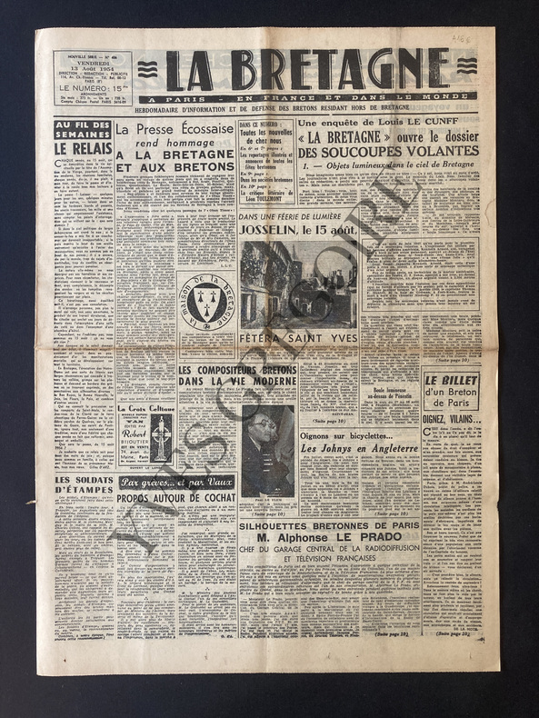 10 PAGES-EN UNE: UNE ENQUETE DE LOUIS LE CUNFF "LA BRETAGNE" OUVRE LE DOSSIER DES SOUCOUPES VOLANTES/1 OBJETS LUMINEUX DANS LE CIEL DE BRETAGNE/SUITE P10-SILHOUETTES BRETONNES DE PARIS ALPHONSE LE PRADO-LES COMPOSITEURS BRETONS DANS LA VIE MODERNE/PAUL LE FLEM/PHOTO-LA CEREMONIE NATIONALE A LA GLOIRE DES RESEAUX D'EVASION S'EST DEROULEE DIMANCHE A L'ANSE COCHAT/DEMI-PAGE/3 PHOTOS-UN JEUNE GARCON DE BLOIS EN VACANCES A BATZ SUR MER EST ENLEVE PAR UNE LAME