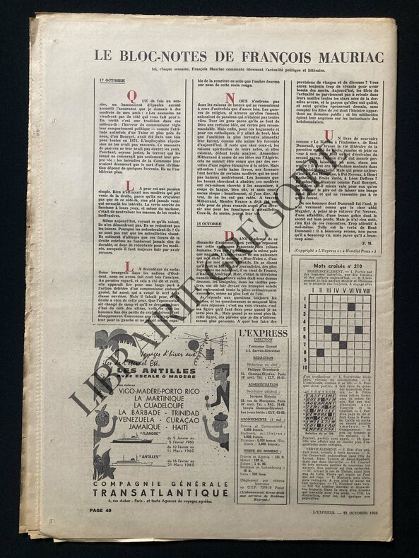1959 Soft CoverN°436 SAISI-40 PAGES-FORMAT 30 CM X 43 CM-DESSIN DE JEAN EFFEL EN COUVERTURE "LA SITUATION POLITIQUE"-LA NOUVELLE SAISIE DE "L'EXPRESS"-PARIS UNE ERREUR DE TIR, ATTENTAT DE L'OBSERVATOIRE, MITTERRAND, 3P, DESSIN DE TIM-ALGER L'INSUPPORTABLE ATTENTE-ENTRETIEN, LA VIE SUR MARS ET AILLEURS-LE MARIAGE CE N'EST PAS DROLE, 150 PHOTOS DE RICHARD AVEDON, 2 PAGES, PHOTOS DE ANNABEL ET BERNARD BUFFET, LE DUC ET LA DUCHESSE DE WINDSOR, GEORGES BRAQUE ET SA FEMME, MARILYN MONROE ET ARTHUR MILLER-PHILOSOPHIE, GABRIEL MARCEL, PHOTO-CLAUDEL JUGE PAR SES CONTEMPORAINS, 7 DESSINS DE SINE-ENTRETIEN, LES NOUVEAUX DEBUTS DE JEAN VILAR, 2P, 5 PHOTOSFine