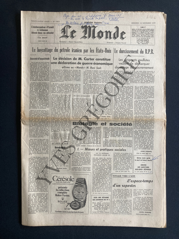 DERNIERE EDITION-48 PAGES-QUINZE JOURS APRES LA MORT DE ROBERT BOULIN ENCORE DES QUESTIONS QUELQUES REPONSES/2P/PSYCHOSE D'UN "COMPLOT POLITIQUE"/RAMATUELLE: UN MAQUIS JURIDIQUE POUR UNE GARRIGUE-LA SITUATION POLITIQUE AU TCHAD-LA PROJECTION DU "PULL OVER ROUGE" EST INTERDITE A AIX ET SALON DE PROVENCE-LES PARTIS PRIS DE GASSIOT-TALABOT/LA FIGURATION EN QUESTION-LEGERES ANNOTATIONS AU STYLO ROUGE