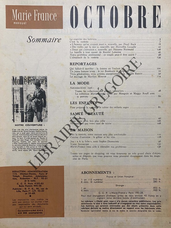 140 PAGES GRAND IN 4-SOPHIE DESMARETS EN COUVERTURE-BAUDOUIN Ier, ROI DES BELGES/8P PAR CHRISTIAN GUY-UNE GRANDE NOUVELLE DE PEARL BUCK "L'HOMME QU'ON CROYAIT MORT"/ILLUSTRATION DE GHIGLIA-"DES VOILES SUR LA MER"/ILLUSTRATION DE CYRIL-UN COUP DE BAGUETTE MAGIQUE.HOP! VOICI LA NOUVELLE MODE./12 PAGES DANS UNE AMBIANCE DE MAGIE-L'ACUPUNCTURE/4P/SOULIE DE MORANT/PHOTO-LE MIRACLE RENOIR/PAR CLAUDE BRULE/8P-MANGUIN ET MAGGY ROUFF ONT CREE LA COLLECTION MARIE-FRANCE/14P-LE CAHIER DES ENFANTS SAGES/10P-A LA FOLIE AVEC SOPHIE DESMARETS-MARIAGE MARYLIN MONROE MILLER PASSEPORT POUR LE BONHEUR?-/4P/2 PHOTOS-EN DERNIERE PAGE PUBLICITE COULEURS POUR LA MARQUE FREGATE/PORT DE CANNES-DESSIN AU STYLO P114