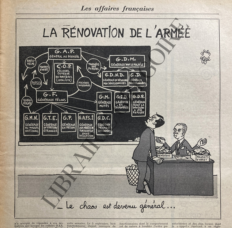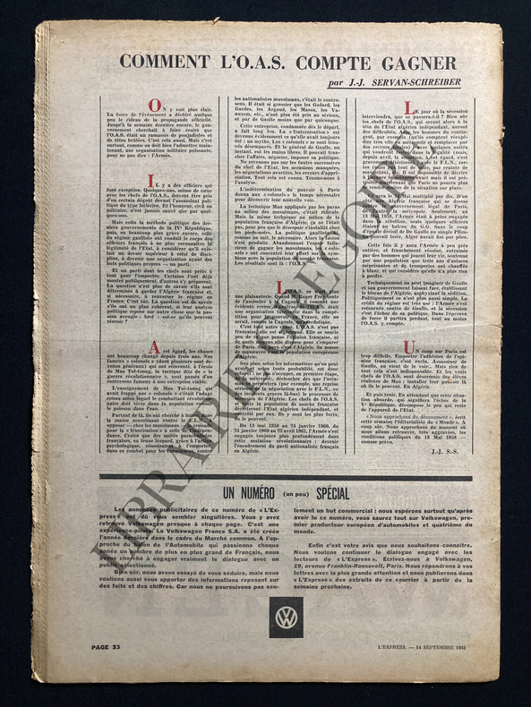 36 PAGES FORMAT 30X42-LE GENERAL DE GAULLE EN UNE-DESSIN DE JEAN EFFEL "LA RENOVATION DE L'ARMEE"-"EPURATION" EN GUADELOUPE-ALGERIE: LE PLAN DE BEN KHEDDA/2P PAR CLAUDE KRIEF/PHOTO/DESSIN DE TIM-REPORTAGE: LES PETITS PAINS DE DAX/1P PAR MICHEL COURNOT/PHOTO THOMAZO-"CE MOT NAVRANT" PAR JULES ROY-PUBLICITE GHIA KARMANN VOLKSWAGEN DECAPOTABLE-LA FRONDE DES GENERAUX/3P PAR JACQUES FAUVET ET JEAN PLANCHAIS/PHOTO INSCRIPTION OAS DANS RUE D'ALGER-LE PAYS LE PLUS CHER DU MONDE/VENEZUELA/2P PAR K.S.KAROL/2 PHOTOS-ROMAN: "LA SECONDE VICTOIRE" PAR MORRIS WEST/PHOTO-DESSIN JEAN EFFEL POUR PUBLICITE VOLSWAGEN-THEATRE AVANT GARDE: "LE REVEUR"/PHOTO JEAN VAUTHIER-REPORTAGE: ANTONIONI AU TRAVAIL/2P PAR MORVAN LEBESQUE/PHOTOS DELON, MONICA VITTI, ANTONIONI-CINEMA: "UNE FEMME EST UNE FEMME" DE J.L.GODARD/PHOTO ANNA KARINA-TELEVISION: LA LUCARNE MAGIQUE/2P PAR JACQUES MOURGEON/2 DESSINS DE TIM-"COMMENT L'OAS COMPTE GAGNER"/1P PAR JEAN JACQUES SERVAN SCHREIBER