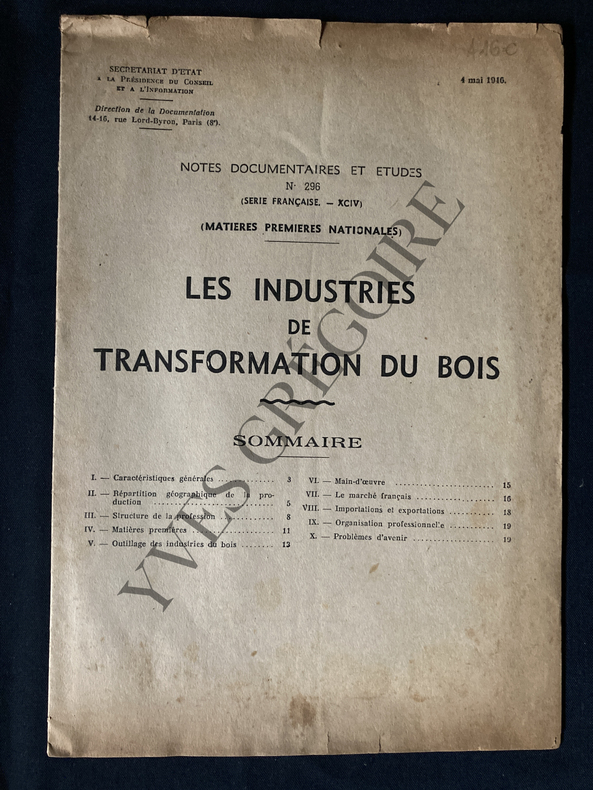20 PAGES FORMAT IN 4-PUBLICATION DU SECRETARIAT D'ETAT A LA PRESIDENCE DU CONSEIL ET A L'INFORMATION-REPARTITION GEOGRAPHIQUE DE LA PRODUCTION-STRUCTURE DE LA PROFESSION-MATIERES PREMIERES-OUTILLAGE DES INDUSTRIES DU BOIS-MAIN D'OEUVRE-LE MARCHE FRANCAIS-IMPORTATIONS ET EXPORTATIONS-ORGANISATION PROFESSIONNELLE-(CPP1)