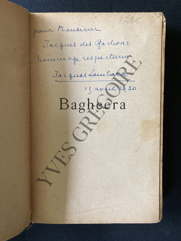 Henri Deluermoz (Paris 1876-1943) réalise cette peinture à l'huile dans le cadre de son oeuvre d'illustrateur pour son fameux "Livre de la jungle" de Kipling édité en 1930 chez Mornay puis dans une autre version en 1941 chez Creuzevault. Cette composition mettant en scène "Le petit d'homme Mowgli" chevauchant sa panthère noire Bagheera en compagnie de son loup, de l'ours et du serpent est une variante de sa composition au lavis de la page 85. Selon E. Bénézit, l'artiste compte "parmi les illustrateurs qui comprirent le mieux l'esprit et l'ambiance si spéciale du Livre de la jungle...". Cet élève de Gustave Moreau et de A.P. Roll, artiste animalier reconnu, "est conservé dans les Musées d'Art Moderne de Paris, d'Oran, de New-York,...". Infimes marques.