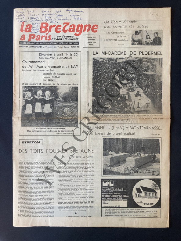 14 PAGES FORMAT 36X51-EN UNE COURONNEMENT DE MLLE MARIE FRANCOISE LE LAY?PHOTO-LA MI CAREME DE PLOERMEL,PHOTO-DE LANHELIN (I ET V) A MONTPARNASSE 300 TONNES DE GRANIT SCULPTE,PHOTO,SUITE P2,PHOTO HABER-ETREZOM,DES TOITS POUR LA BRETAGNE,PAR LOUIS LE CUNFF-GLENMOR ET XAVIER GRALL A LA MJC DE VIRY CHATILLON,PHOTO-LE GIGANTESQUE PROJET DE SIX ETUDIANTS BRETONS PASSIONNES D'ETHNOLOGIE,DEMI PAGE,2 PHOTOS,CARTE-SAINT MALO,DUGUAY TROUIN,PREPARATIFS-ACHILLE ZAVATTA A INAUGURE LE STAND DE BALL TRAP DE LA CAGE A LANGUEUX-L'HORTICULTURE STOPPERA T ELLE L'EXODE DE BELLE ILE?,TIERS DE PAGE,PHOTO-POUR LA PREMIERE CHAINE,ON TOURNE A IRVILLAC "LES TROIS MORTS D'EMILE GAUTHIER",PHOTO-CARNET D'UN BRETONNANT LE JEU DE GALOCHE,PAR PIERRE JAKEZ HELIAS,TEXTE FRANCAIS ET BRETON-QUELQUES ANNOTATIONS EN UNE