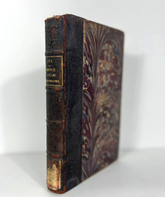 1 vol. in-12 reliure de l'époque demi-basane marron, dos lisse orné, Chez Magimel, 1815 et 1813, 188-36 pp., 236 pp. avec 2 planches dépliantes. Rappel des titres complets : Ordonnance pour régler le service dans les Places et dans les Quartiers du 1er mars 1768. Collationnée sur l'Edition originale, et accompagnée d'une Table analytique des Matières ; suivie du décret du 24 décembre 1811 sur les Etats-Majors des places [ Suivi de : ] Extrait du Règlement provisoire pour le service des Troupes en Campagne, Imprimé pour l'armée d'Allemagne, par ordre de S.M. l'Empereur et Roi. A cette réimpression on a ajouté les changemens résultant des différens ordres donnés par Sa Majesté, et le décret du 22 févirer 1813 sur les équipages, sur l'Edition de l'Imprimerie Impériale de l'Armée
