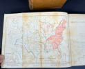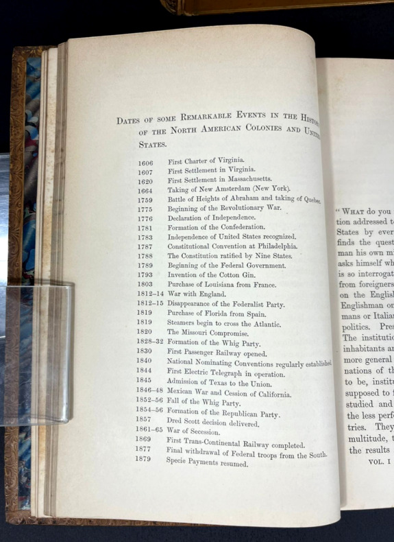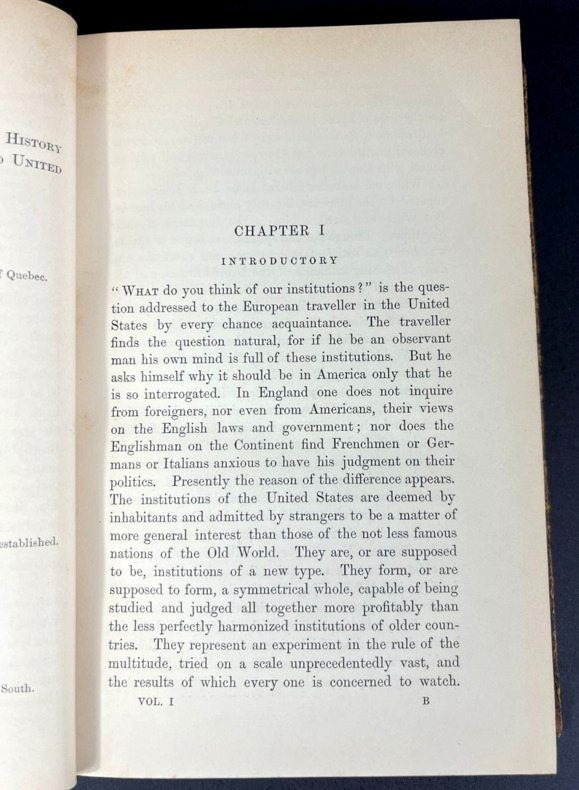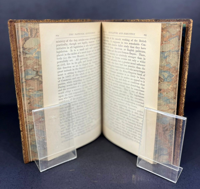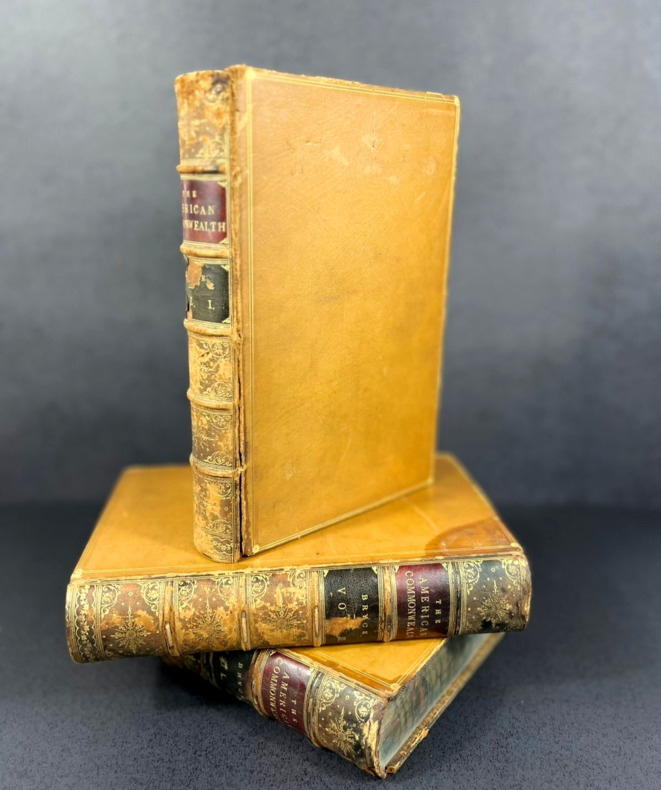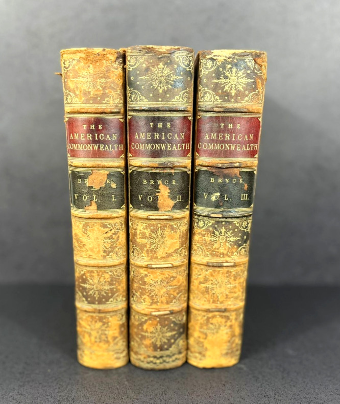 London and New York, MacMillan, 1888. Three volumes bound in full vellum leather. First edition. Three delicately bound 155 x 220 mm (6" x 8.5") volumes of (xxxii) 592, 683 and 699 pp. Full caramel vellum leather, intricately ornated spines with 5 nerves, gilded frames and boxes containing lush greenery-inspired patterns and fleurons, all gilded, double titlepiece with the book title, author's name and volume Roman number on dark red and anthracite backgrounds, gilded floral frieze on the tails. Covers with double gilded frames and tiny corner flowers. All fore-edges colored in a mostly blue polychromia with marbled red veins. Gilded roulette work on the edges of the covers and pastedowns, colored endpapers. Unidentified ex-libris on the first pastedown bearing the motto "Ab Multis Ad Unum." With an unfolding map of "The Growth of the United States" at the beginning of the first volume. Table of contents at the beginning and index at the end of each volume. First volume: The National Government. Preface. Second volume: The State Government and the Party System. Third volume: Public Opinion, Illustrations and Reflections, Social Institutions. This book is not an encyclopaedia of the institutions of the American Republic, even though it may look like it is. Actually, James Bryce talks about the real workings of the institutions: parties, bosses, the spoil system and the public opinion. It shows an America already different from what the mere Constitution says. He compares the British monarchy with the American federal republic, the democratic versus lord elites and the centralization vs local power dynamics. By doing so, James Bryce predates the sociology of Robert Mitchels and Max Weber while maintaining the magnitude and depth of a true treatise. An analytical tour de force, worthy of a serious Americana collection.